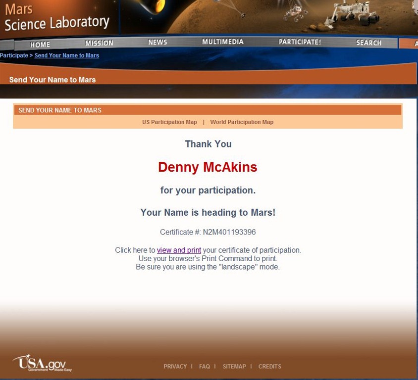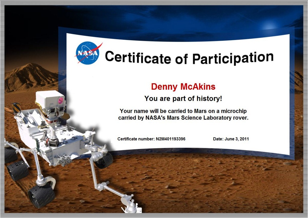 Well I am one of the lucky ones whose names will be sent to Mars as permanent emblem to humanity on NASA’s Mars Science Laboratory (MSL) rover. If you can’t be there physically, be there virtually. Something of yours truly will live forever on Mars!