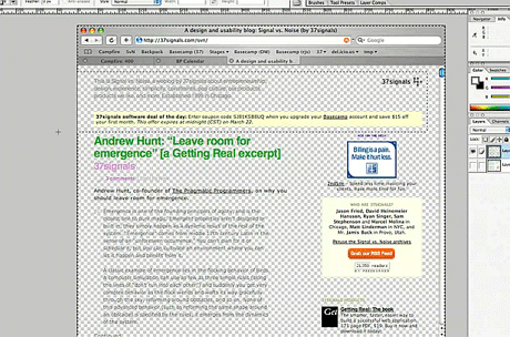 –Create your basic layers and groups. Make folders for the banner, navigation, sidebars, content, and footer. Create corresponding layers and give them a fill. You’re still just organizing, which sucks, but this is your first visual representation of the site—use this opportunity to tweak structure while it’s easy.