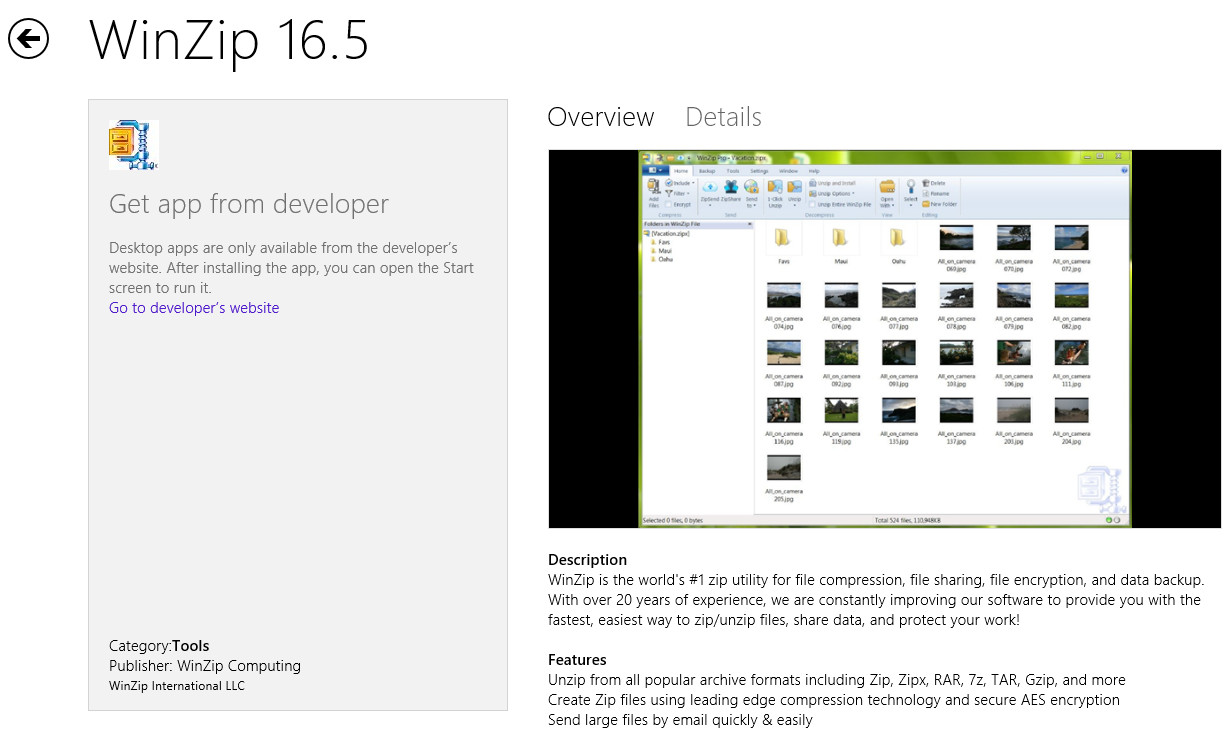 The 3rd Desktop App to report itself into the Store is WinZip. Of course the app need no Intro, fine that you can now easily find and install it. It can be found in the Tools section.
