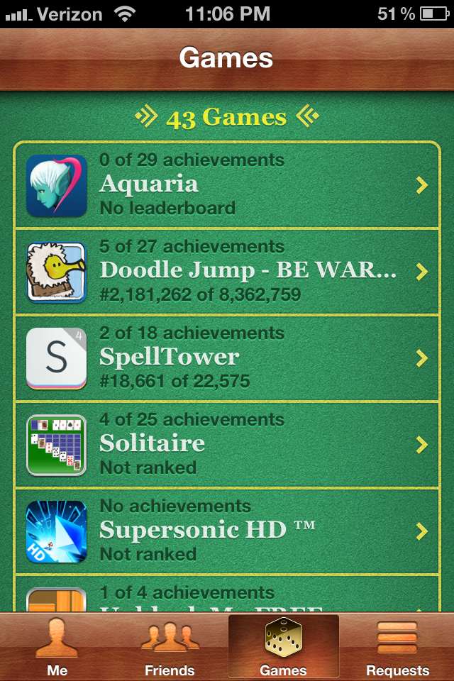 More involved presence. While Game Center links every game, its presence within these games is often kept to a bare minimum, if anything at all. Once again, I’d like to make connections to Xbox Live and PlayStation network, which alert the player with a simple notification that they have unlocked an achievement or trophy. With games on iOS, there is no such thing unless otherwise created by the designer, which may or may not align with Game Center’s achievements to begin with. What I would like to see is a more dominant role within games. Currently, the only sign of it is when you open an app and receive a simple little message welcoming you back to Game Center. This same little appearing bar could easily appear at other times to say something as simple as “Achievement Unlocked – Achievement Name – 15 Points” before disappearing once more. This not only alerts the player of their achievement, but also encourages them to take another peek at Game Center and see what else has happened.