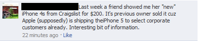 Last week a friend showed me her “new” iPhone 4s from Craigslist for $200. It’s previous owner sold it cuz Apple (supposedly) is shipping theiPhone 5 to select corporate customers already. Interesting bit of information.