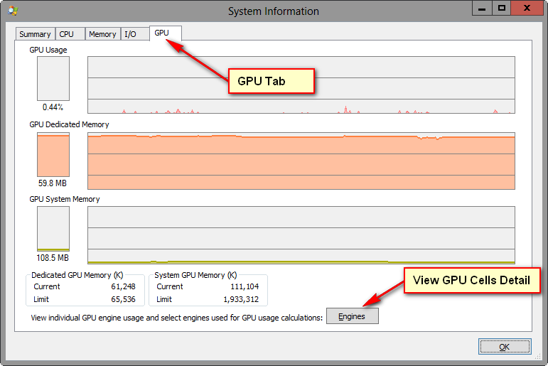 4. Select the GPU tab and Click the Engine button. GPU Engine History screen opens: