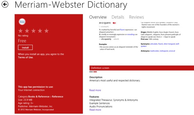 Well, my much beloved Dictionary App from Dictionary.com just got a competition in the Windows 8 Store. The much respected Merriam-Webster Dictionary app just joined the club for the erudite amongst us. The bookworm in me leaps for joy. Another reference material, the more the better right?