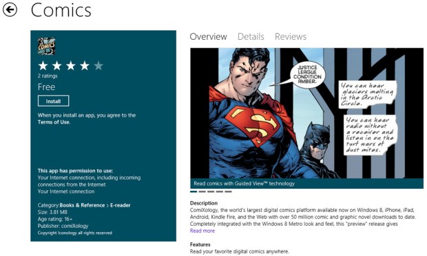 The first Comic App has just appeared in the Store. Comics boasts to provide you with 50 Million comic and graphic novel downloads. Implemented in the beautiful Metro look and feel, with Metro panoramic views was made for reading things media this. This is a multi-platform app, available on iPhone, iPad, Android, Kindle-fire etc, and now on Windows 8. The app is available for both Intel and ARM platform. Click on the picture above to download the app.
