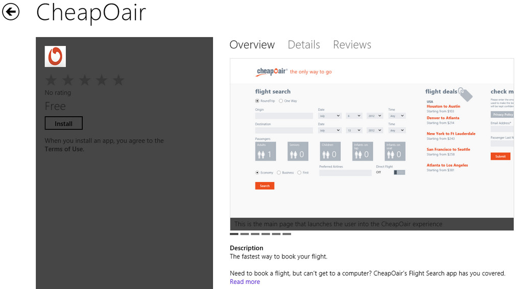 Need to book a flight, but can’t get to a computer? CheapOair’s Flight Search app has you covered. Quickly search millions of discounted flights and once you find exactly what you’re looking for, book it with ease from your Windows 8 device! Be confident in your booking price, too – CheapOair offers savings of up to 65% off!