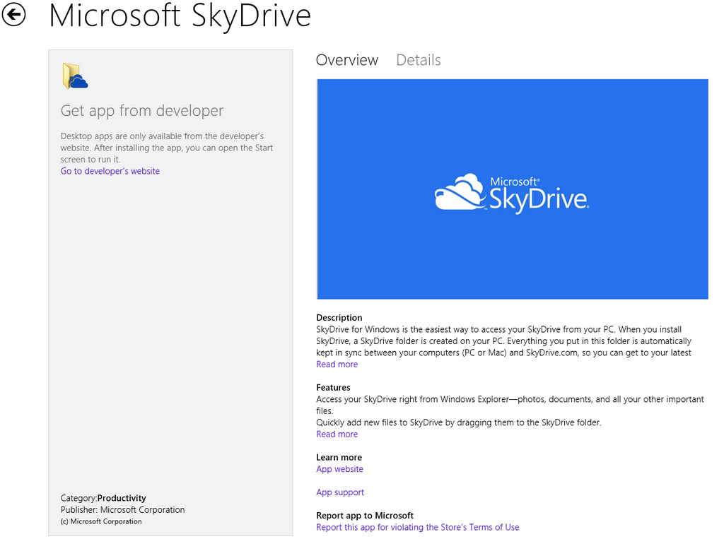 Remember Microsoft LiveMesh? If you do, then you already know Microsoft SkyDrive Desktop App, because it is the incarnation of Microsoft LiveMesh without the Screen share feature. Microsoft just dropped the App link on us in the Windows Store for easy reach and visibility. Note that this app is complementary to the Metro Skydrive App. With this app, you can drag-and-drop files in Windows Explorer on the desktop to SkyDrive, and your folders are synced between all computers on which you install this app with your Microsoft Account.