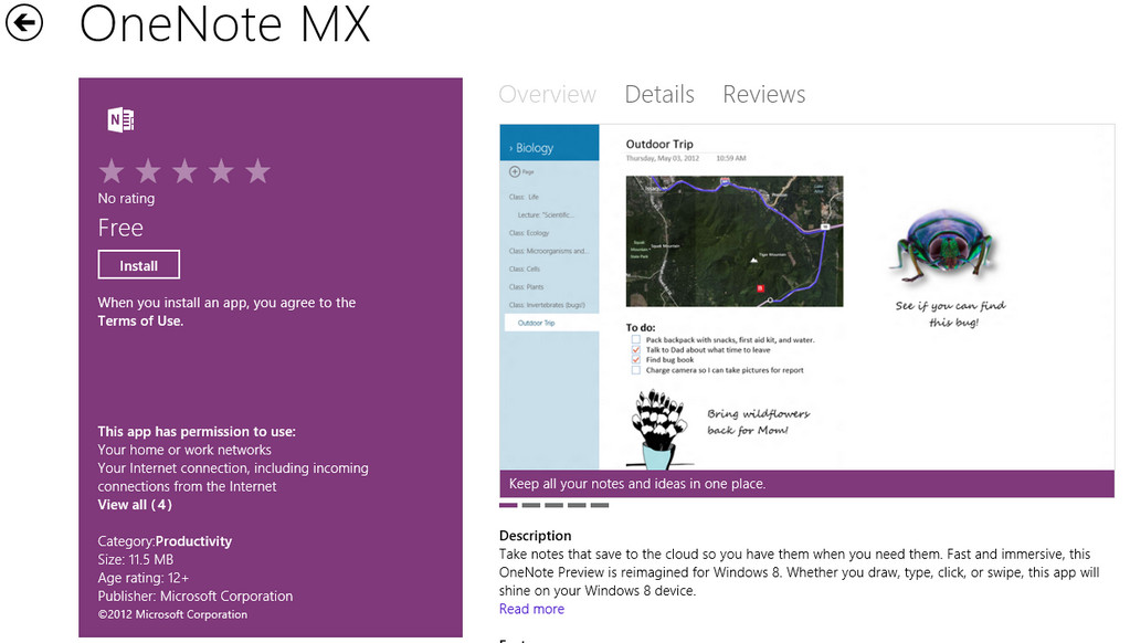 At last, the OneNote MX app is in the store. I have been trying to find it in the Store since announcement yesterday by Microsoft, it could not be found by any means. Thanks to our MS pundit Paul Thurrott who informed you should just look under the Productivity section and NOT search for it. Now I can confirm the app is indeed in the Store.