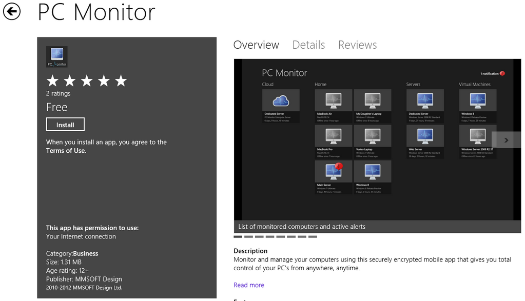 Ladies and gentlemen we have the first true comprehensive tool in the Windows 8 Store. PC Monitor from MMSoft is indeed a Network Admin dream come true on a Mobile device. With the app you can monitor your whole network and see the status of all your servers and clients. You can see the configuration of the node and run commands on it. I haven’t used the app yet, so I don’t know if you have to install a client app on the nodes or not. You will need to register and install a client app to use the this App. But the app is looking to be a good management app for Professionals and Enthusiasts alike.