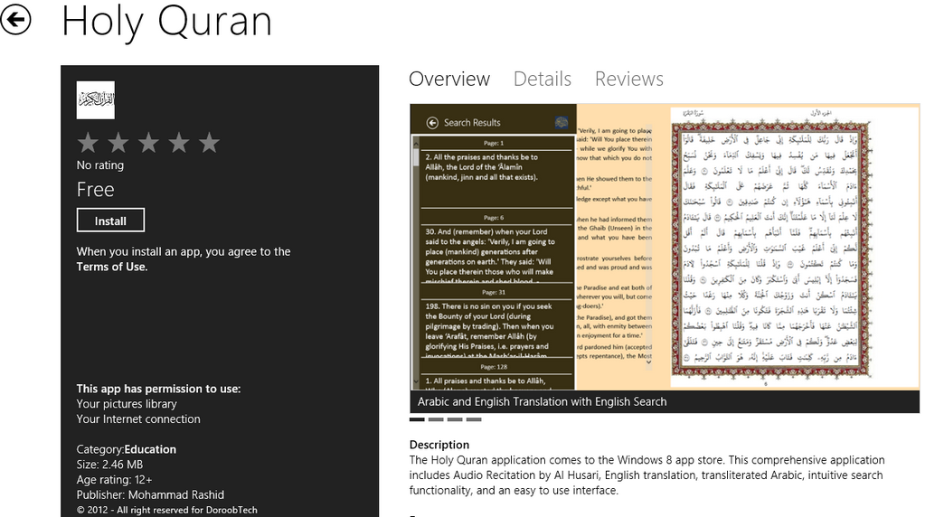 The Holy Quran application comes to the Windows 8 app store. This comprehensive application includes Audio Recitation by Al Husari, English translation, transliterated Arabic, intuitive search functionality, and an easy to use interface.Features