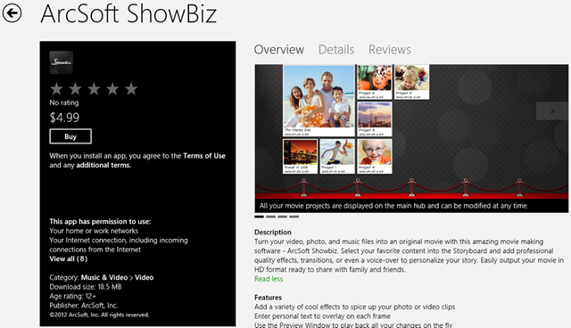 ArcSoft ShowBiz joins PowerDvD and PowerDirector from Cyberlink in the Store as another quality App for managing and creating your own Videos/Movies. The advantage in this case is that the app $10 cheaper than Cyberlink products at $4.99 which is not bad considering what you can all do with these apps. Here is another feather to Microsoft’s cap in attestation of quality apps for the new platform.