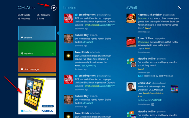 Here we go Ladies and Gentlemen, the GA is approaching fast and Microsoft delights us all by updating all the Built-In Apps. But right on the heels of Microsoft, serious App Developers are releasing updates to their apps too. We’ve been seeing a lot of app Updates in the Store and just a minute ago MetroTwit also updates in the Store. I’ll be updating with new features, but just to let you know, see for yourselves. Investigating here.