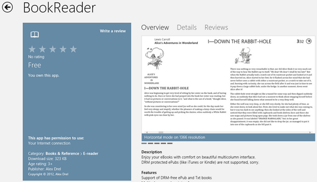 The first truly-working ePub reader is now in the Store. BookReader truly works with non-DRMed eBooks. The App leverages the full feature of Metro Design Language to bring a pleasurable reading experience to Windows 8 devices unlike some Reader Apps in the Store. Hello Kindle app, I am looking at you!