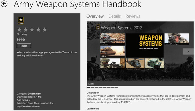 The Army Weapon Systems Handbook highlights the weapon systems that are in development and fielded by the U.S. Army. This app is based on the content contained in the 2012 U.S. Army Weapon Systems Handbook prepared by ASA(ALT).