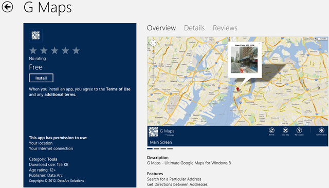 OK, here is another useful app from the Store if you don’t use Microsoft’s Bing Maps App. G Maps is indeed Google Maps App in the Windows 8 Store, and I am impressed with the app. Even if you use Bing Maps, you want to have such an App as this for backup. This app includes Turn-by-turn navigation feature of Google Maps. I am yet to test its Turn-by-turn, but I am sure you’ll be impressed too. Here is quoting the app from the Store: