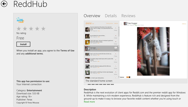 ReddHub is the next evolution of client apps for Reddit.com and the premier reddit app for Windows 8. While maintaining a rich modern experience, ReddHub is feature rich and designed from the ground-up to make it easy to browse your favorite reddit content whether you’re using touch or keyboard!