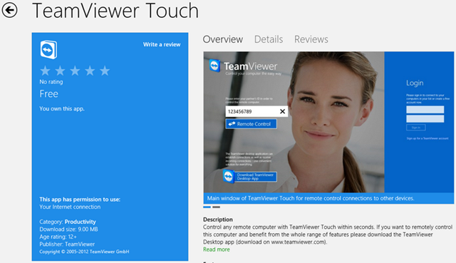 As you can see above I have already installed the app and taken it for a spin. I can say, it works as advertised. You can only initiate outbound connection to remote hosts, you will never be able to connect to TeamViewer Touch from outside. Security feature of Windows 8 of course. Here is TeamViewer GmbH’s description of the App from the Store: