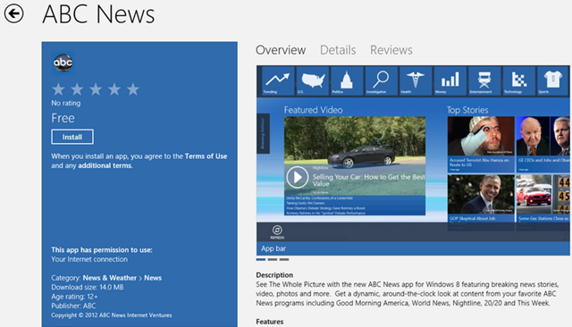 And here is the official ABC News App for your pleasure. It comes rather packed with features, just look at its size, 14.0Mb. That is huge for a Metro App. Here is ABC News Corp’s description of the App in the Store: