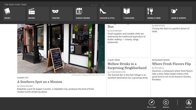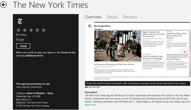 The New York Times app for Windows 8 is free to download and includes free access to the Top News section. Subscribers get full access to over 25 sections plus unlimited access to NYTimes.com on any device. Existing subscribers with NYTimes.com + Tablet Apps or All Digital Access can simply log in to get full access to this app as part of their existing subscription.