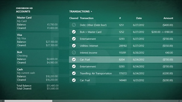 You want an application, which you can use as a checkbook for all your accounts, and always stay aware of how much money is left on each of your accounts, and how it happened. You can import your banking records using your bank’s OFX file or manually add entries that change balance on your accounts. You can schedule recurring transactions, add both income and expenses, schedule delayed transaction and clear them later (feature known as reconcile), and see colorful charts, which represent activity of your accounts.