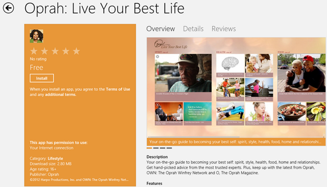 Another OWN (Oprah Winfrey Network) app just dropped in the Store, joining their first App. Yet another sign of companies warming up to Windows 8. This app is of course complementary to the first app, its an attempt to broaden Oprah’s vision on guiding people to live a good and healthy life. If you can argue that the first app is targeted towards Women fans of Oprah, well, this second one is for both Men and Women generally. Here is how OWN describes the App from the Store: