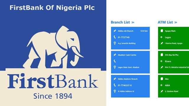 First Bank of Nigeria Plc app provides Branch and ATM locations nearest you and information about FirstBank products and services. First Bank Nigeria Plc is a national icon and an international player in the financial services industry. The bank is over 110 years in existence during which it pioneered the art and science of modern banking in the country, becoming Nigeria’s biggest and most prosperous financial services groupFeatures