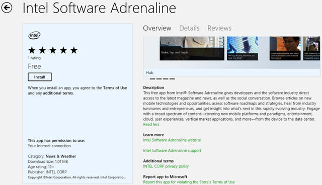 How did I miss this, the Third App from Intel is in the Store! The Intel Software Adrenaline app is to rally Intel Developers base, bringing them latest news and information about everything Intel. Here is the official Description from the Store: