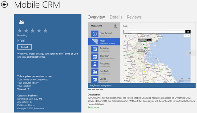 IMPORTANT: For full experience, the Resco Mobile CRM app requires an access to Dynamics CRM server (4.0 or 2011, on-premise/online). Without this access you will be only able to work with the local demo database.