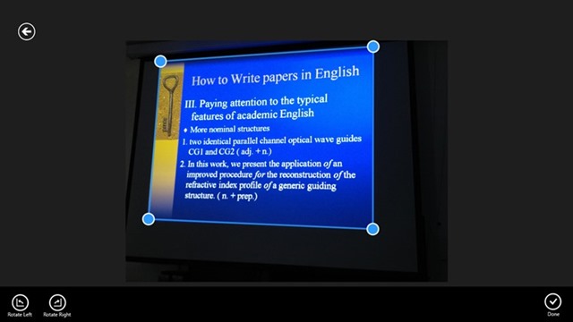 Intelligently crops and corrects the skew of captured presentations from whiteboards, slides, posters and more