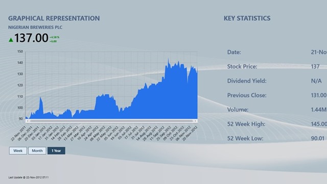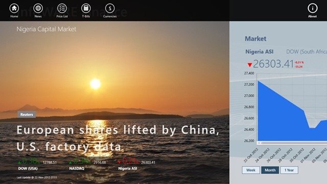 InfoWARE Finance – Nigeria provides access to business and financial news on Capital markets and specifically about Nigeria and its capital market. It includes stock prices, daily top gainers and losers, top movers (volume), bond prices, Nigeria Naira currency rates as well as other world currencies. It also includes various analytics such as weekly, monthly and yearly charts with drill in capabilities, moving averages etc.