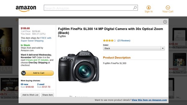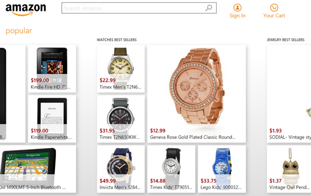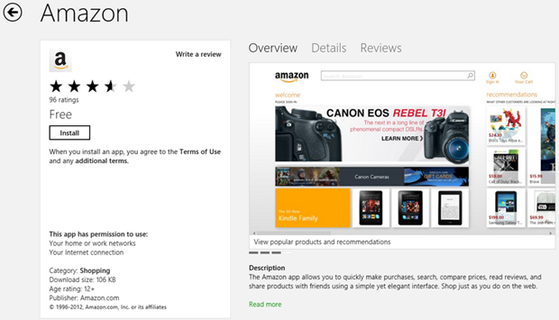 At last! The Amazon App is now in the Windows Store! Wow, the really took their time coming. EBay and Newegg have been rocking the Store since Jove knows when, now Amazon joins the hustle. As you can see the App already garnered 98 ratings at almost 4 Stars. I wonder who are those people who rated it, as those are not the public, the App is just out! Probably those are Microsoft internal users and testers who were testing for Microsoft and Amazon as they need to get this right the first time.