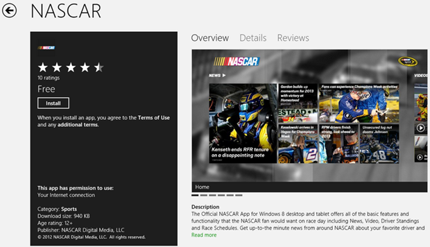 The Official NASCAR App for Windows 8 desktop and tablet offers all of the basic features and functionality that the NASCAR fan would want on race day including News, Video, Driver Standings and Race Schedules. Get up-to-the minute news from around NASCAR about your favorite driver and upcoming events for the 2013 NASCAR season. Download the Official NASCAR App for Windows 8 and you’re covered through the checkered flag!Features