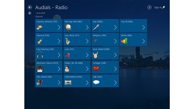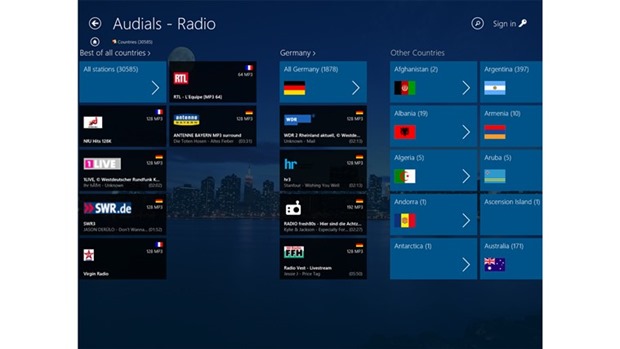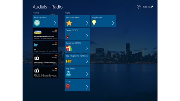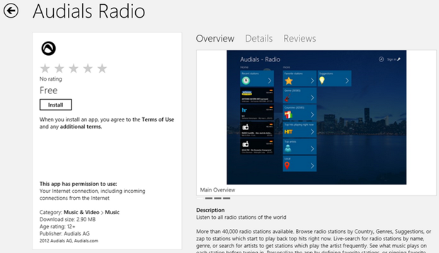 More than 40,000 radio stations available. Browse radio stations by Country, Genres, Suggestions, or zap to stations which start to play back top hits right now. Live-search for radio stations by name, genre, or search for artists to get stations which play the artist frequently. See what music plays on each station before tuning in. Personalize the app by defining favorite stations, or pinning favorite genres or artists to the home view. Listen to radio in snap-in view. Always see cover pictures of currently playing track.Features