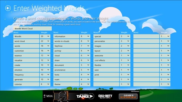 – The words, or short combination of words, you want included in the word cloud. Just enter the words and their weight. The weight determines the size of the word in the resulting word cloud.Features