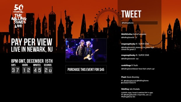 Don’t miss your chance to experience The Rolling Stones – LIVE – from the Prudential Center on December 15, 2012. It’s the concert of the century – available to you via Pay-Per-View on this breathtaking app for your Windows 8 device.