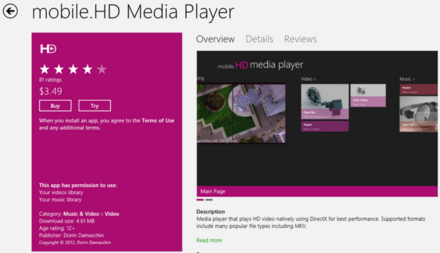 This is the very app you wanna get right now if you are into diversified media formats. This is the first App that I know that play MKV as you can see in the Description. Until VLC project and Media Player Classic release their Windows 8 apps, this app is going to reign supreme for those of you not bought into MP4 and WMV formats. It’s a paid app as you can see, so you might as well reward the Dev for his efforts. I mean, it costs less than your typical Mocca-Latte binge. For the quality of the App there can be no doubt as many have gone the route before you and qualified the app with more than 4-Stars at 81 ratings presently. So it seems to be a solid app. Here is more from the Dev: