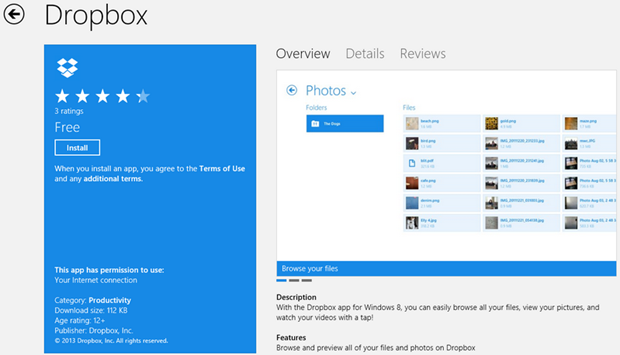Yep, the Official Dropbox is now in Windows Store! We’ve been waiting for this for such a long time, and there have been multitudes of wannabe clients in the Store, but there is nothing like a client bearing the name of the Service provider itself. We will never know what kept Dropbox this long, especially because this is such a small app clocking only 112Kb. It seems to be something you could write in a weekend, but since MS announced this app with Win8 go-life in October, what could have kept this app for so long.