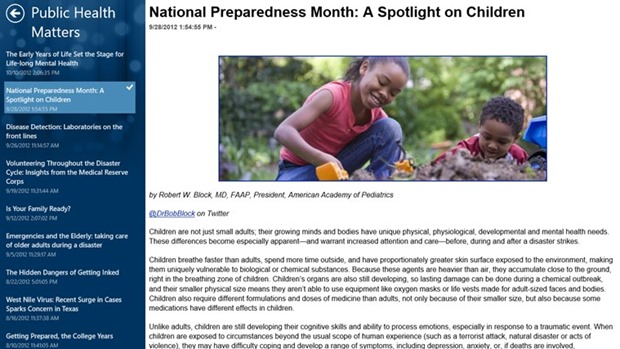 The CDC application has been designed as a way for users to access health information at their fingertips. It features important health articles, popular journals, timely updates and access to social media to coincide with important health concerns and events throughout the year. It gives an increasingly mobile public 24/7 access to important and timely health information that people can use to protect their lives and loved ones.