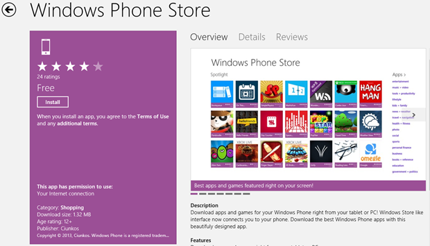 Download apps and games for your Windows Phone right from your tablet or PC! Windows Store like interface now connects you to your phone. Download the best Windows Phone apps with this beautifuly designed app.Features