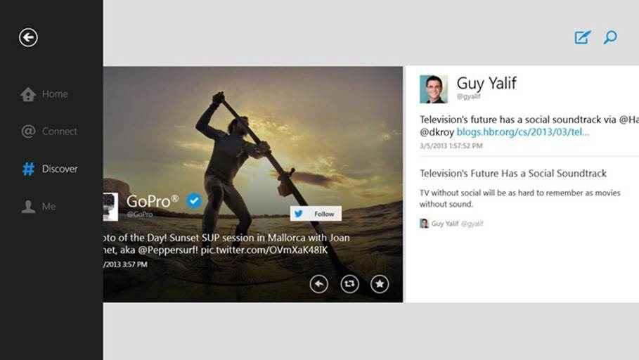 – Create the ultimate screen with Snap view on Windows 8. Drag Twitter into the narrow side of the screen and slide in another favorite app. You can stream a live video while you watch the conversation about it unfold on Twitter. Then use the Share charm to join the discussion.