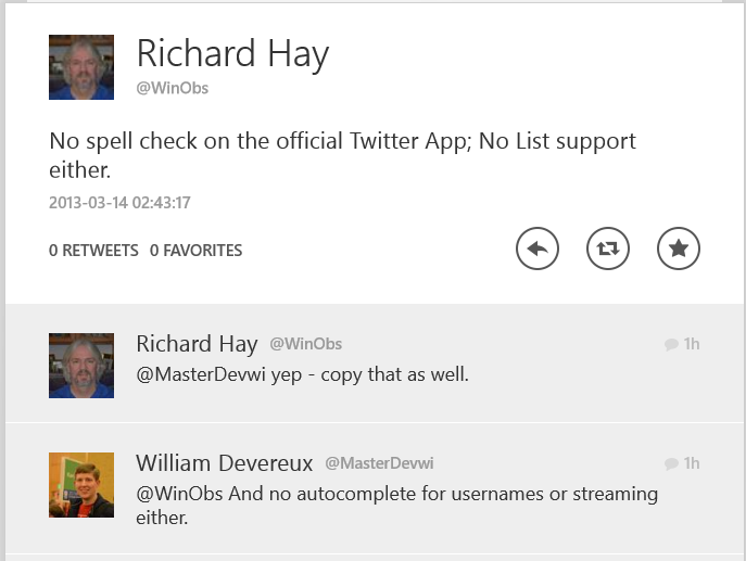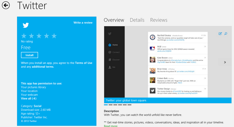 . Most of you probably heard the news already. The Twitter official App is now in the Store. A lot many people, including yours truly, are disappointed with the app because it is just so basic. Given the amount time we’ve had to wait for the app (since November 24th 2012), does Twitter really need Six months to release such an App? Looks like what someone could do in a weekend. There are definitely apps in the Store that beat Twitter’s app. It may be me, but the current version of the App doesn’t support Lists. I would have expected a generous use of Windows 8 panoramic features to show columns, but you’re constantly going in and out of screens. Messages for example is buried deep you have to know where to find it. This is really lame Twitter. Definitely not what we expected. Absolutely an anti-climax. Like a good friend of mine said: