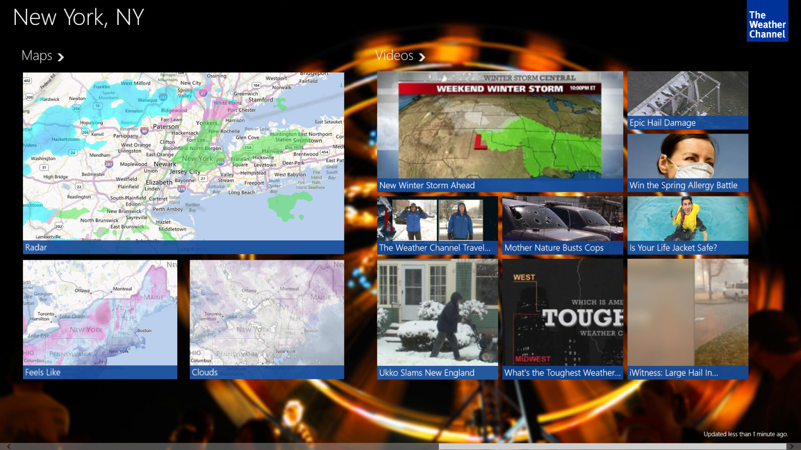 The Weather channel features video clips from its television programing that you can watch directly from the app if you are connected to the internet. The live tile is more informative than the Bing Weather app and has icons more in line with the Metro design guidelines. It also seems to have more location than does the Bing Weather app. For example, the weather app fails to find my location, which is Dunlap Illinois, and defaults to the nearest city, Peoria. The Weather Channel app seems to find Dunlap just fine.
