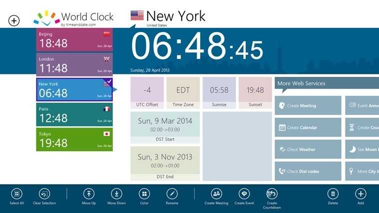 - • Quick access to some of timeanddate services, allowing you to quickly plan a meeting or event, create countdowns, check the weather, check moon phases, and find dialling codes.