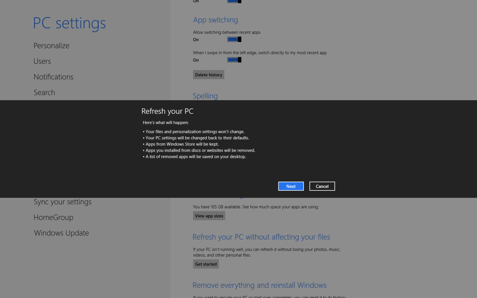Here’s a quick background on what the reset and refresh functionality is. Basically, it is a “push-button” reinstallation of Windows. The refresh option allows you to reinstall Windows while keeping your files and settings intact, and the reset option allows you to do a easy, once-click, clean install of Windows. This feature is very important, as you might need to reinstall your OS if you are experiencing slowdowns or are infected by a computer virus.