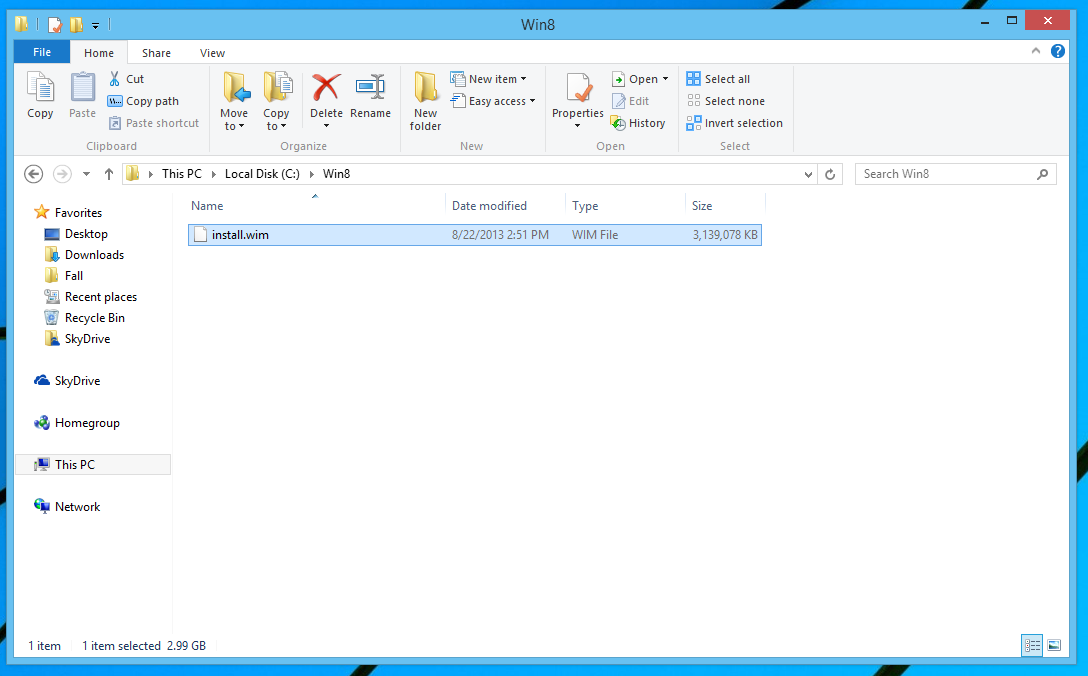 Open “This PC” and go to the C drive. There, create a new folder called Win8 (You can call it whatever you want, actually. Just remember to replace ‘Win8’ with the name you have given it in the steps below).