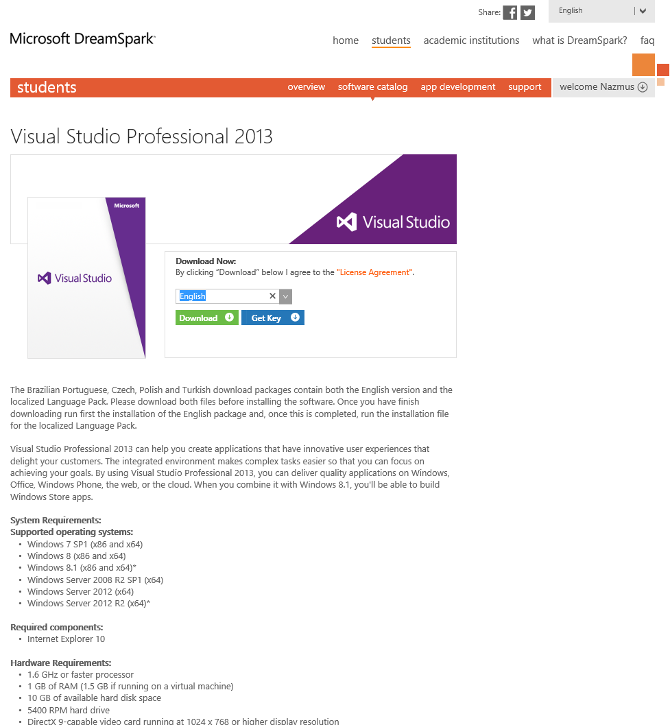 Good evening! Great news if you are a student. Starting today, you can download and install the full version of Visual Studio 2013 Professional. You can do this through Dreamspark. We blogged earlier that Microsoft Dreamspark users would be able to download the software on October 31, 2013. Well, today is the day. Here’s how to get your copy if you are a Student.