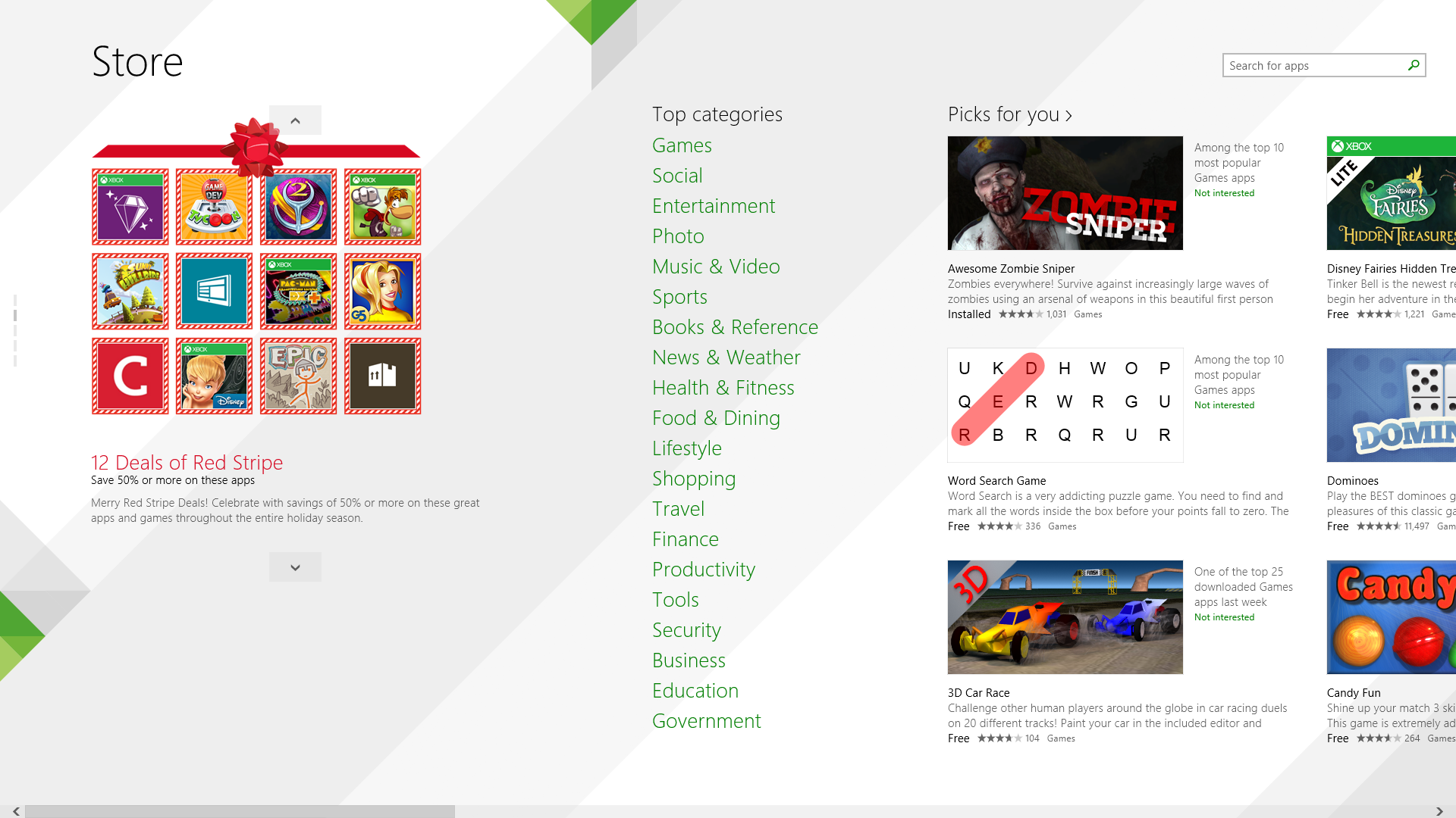With the latest update, the Windows Store app categories are placed right in the home page, after the spotlight apps. That way, users can see and navigate to any categories they choose. Within a category’s main page, the subcategories are also displayed. For instance, in the screenshot below, you can see the various Games subcategories shown in the Games category page.