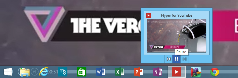 With Windows 8.1 Update 1, apps that play audio and video in the background, such as Xbox Music, Multimedia8, and Hyper for YouTube, will now see a media control in their taskbar thumbnail. Whenever such modern apps is running, hovering over the app’s button on the taskbar will pop up its thumbnail, which sports dedicated media controls that you can use to play, pause, or skip forward and back media. Pretty cool huh? Take a look at the screenshot below.