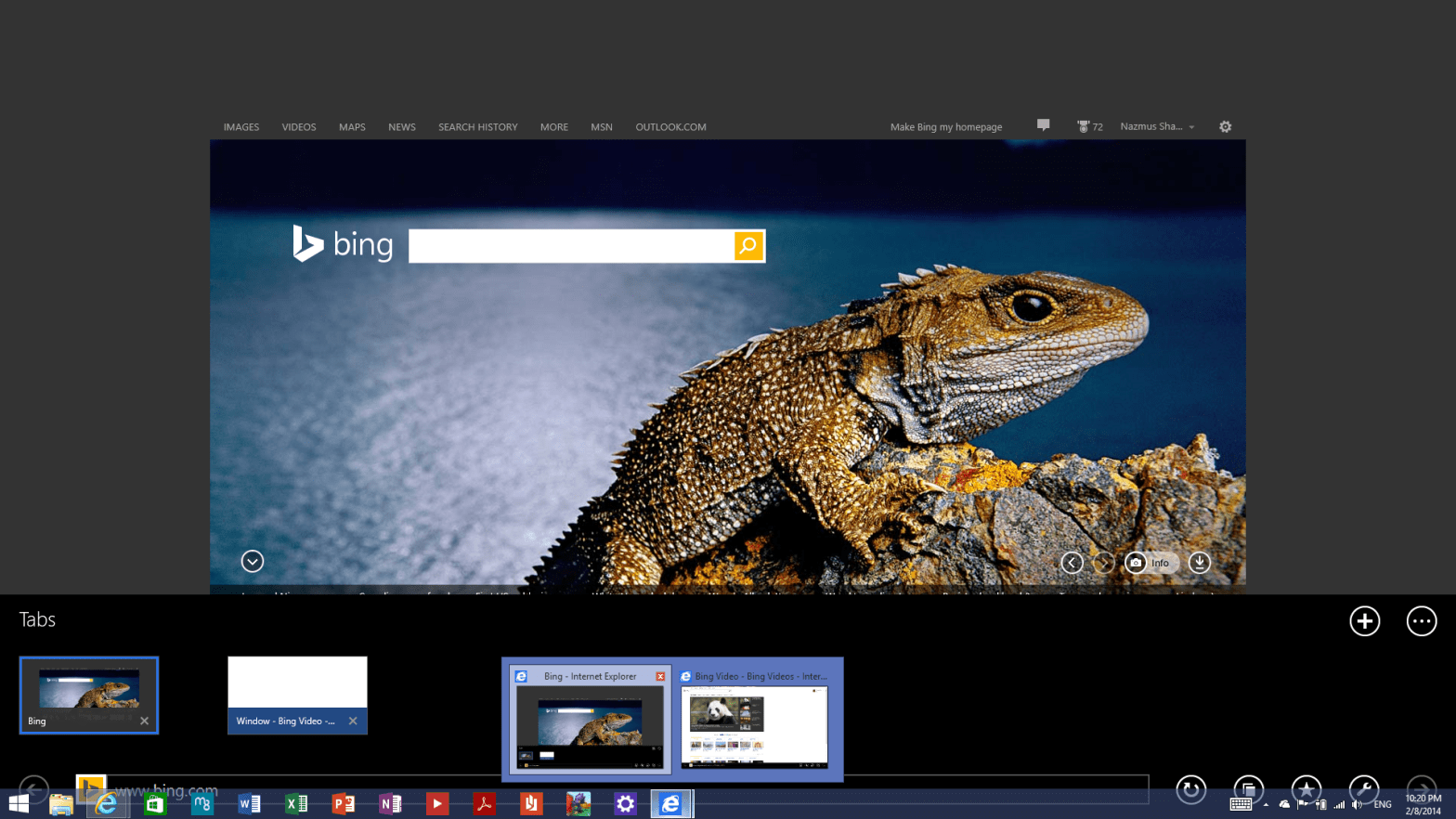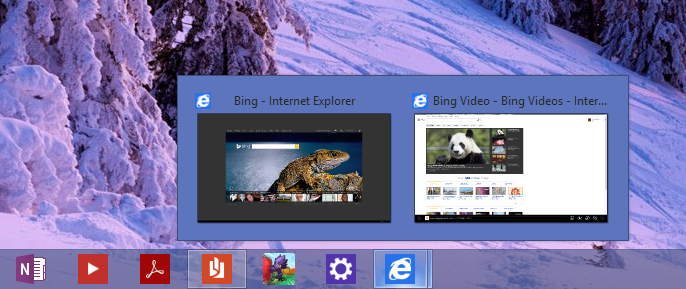 Here’s an example of this in action. In the figure below, notice that I am running the modern (metro) version of Internet Explorer. Also notice that I have two instances of the modern application running, and those two instances are being shown as separate thumbnails within the same application icon on the taskbar.