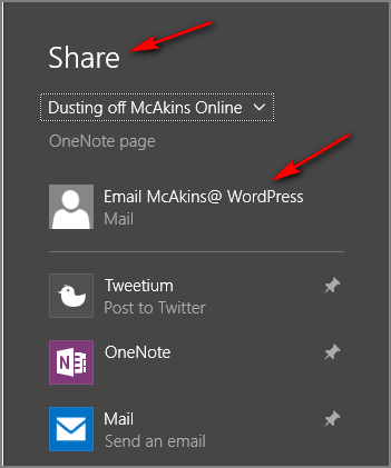 Now suppose I could compose my blog posts in OneNote, with its rich writing experience, spell-check, and formatting experience, I could just press the Share to button, select to Share to Windows 8 Mail App, select my Blog WordPress mail address and presto, a blog post. I am in paradise!