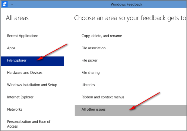 As you can see from the comments below, with Build 9879 Microsoft has removed the “All other issues” category for File Explorer, so I have recreated in the “Libraries” category as follows: